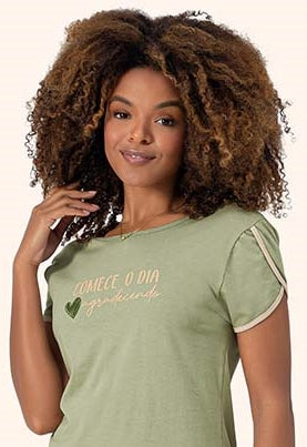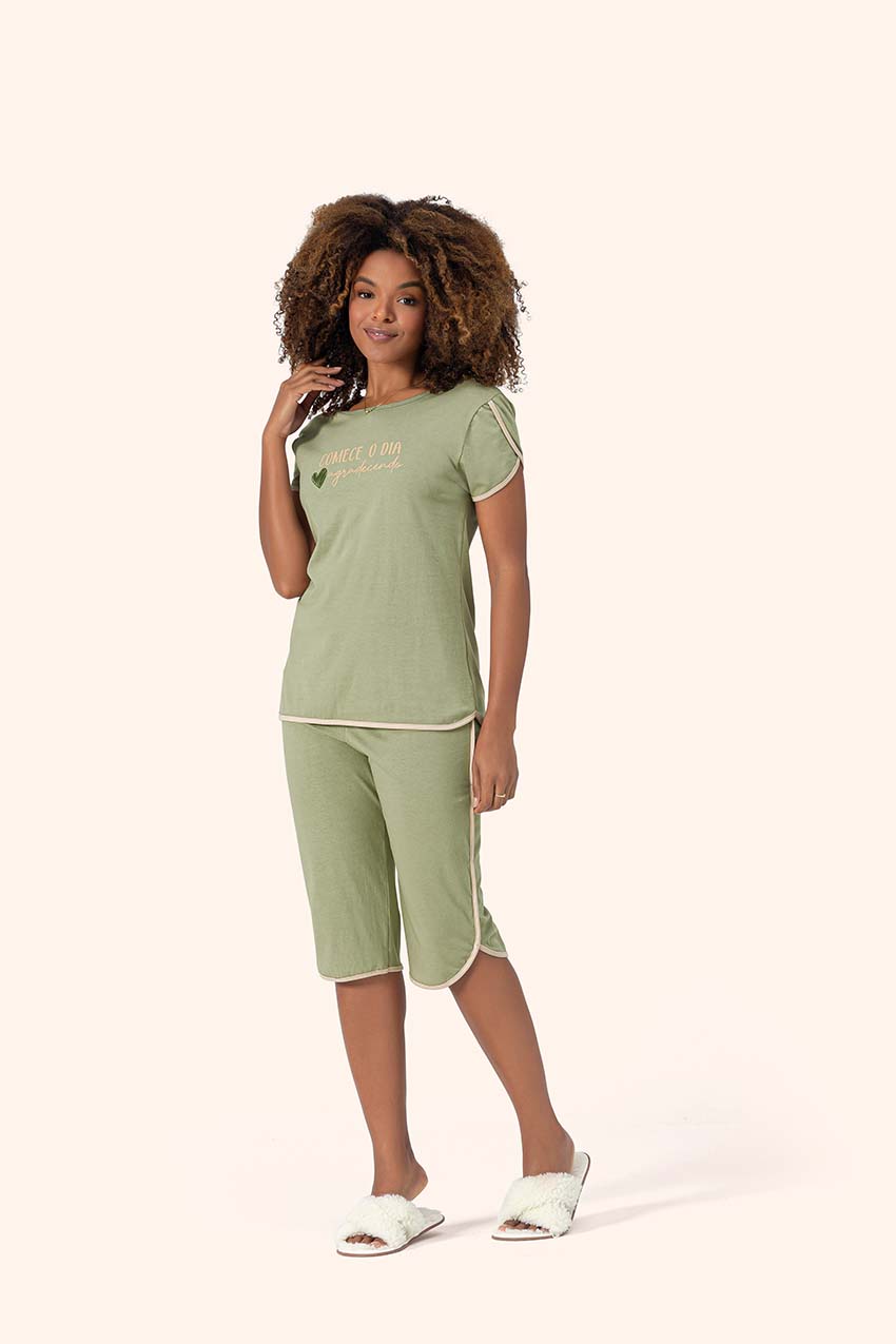 Pijama tipo Pescador Manga Curta Linha Pureza na cor verde com viés na cor nude, com detalhe aberto na manga, com estampa "Comece o dia agradecendo", produto com selo de sustentabilidade.
