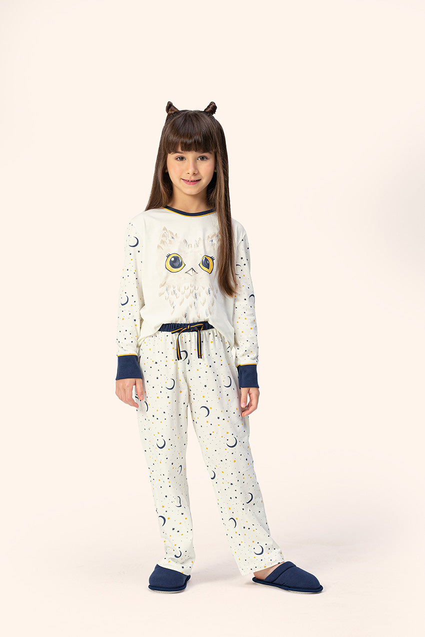 Pijama infantil de manga longa em malha 100% algodão na cor branca com estampa de coruja.