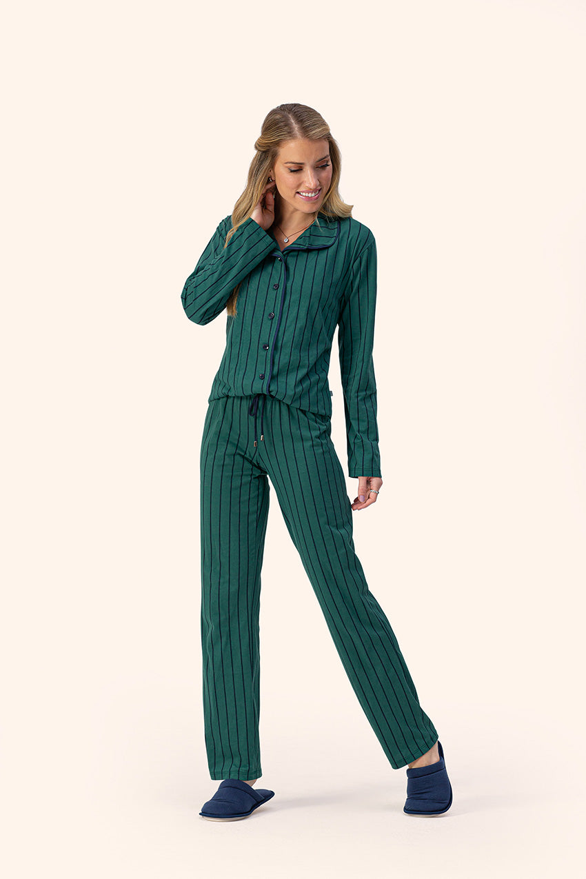 Pijama de manga longa aberto em malha 100% algodão na cor verde escuro com listras na cor preta.
