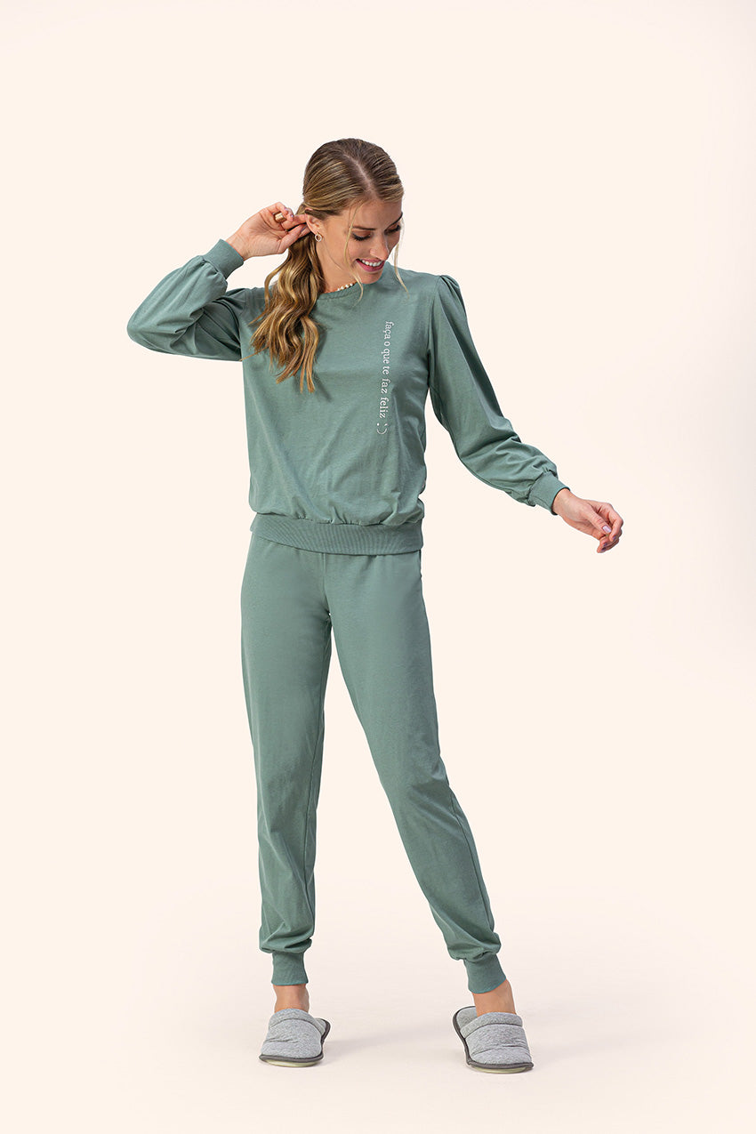 Pijama de manga longa na cor verde com detalhes em prata em malha de moletinho flanelado.