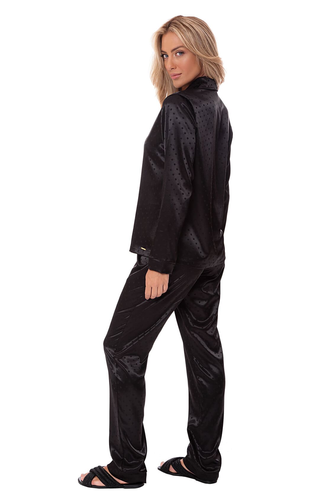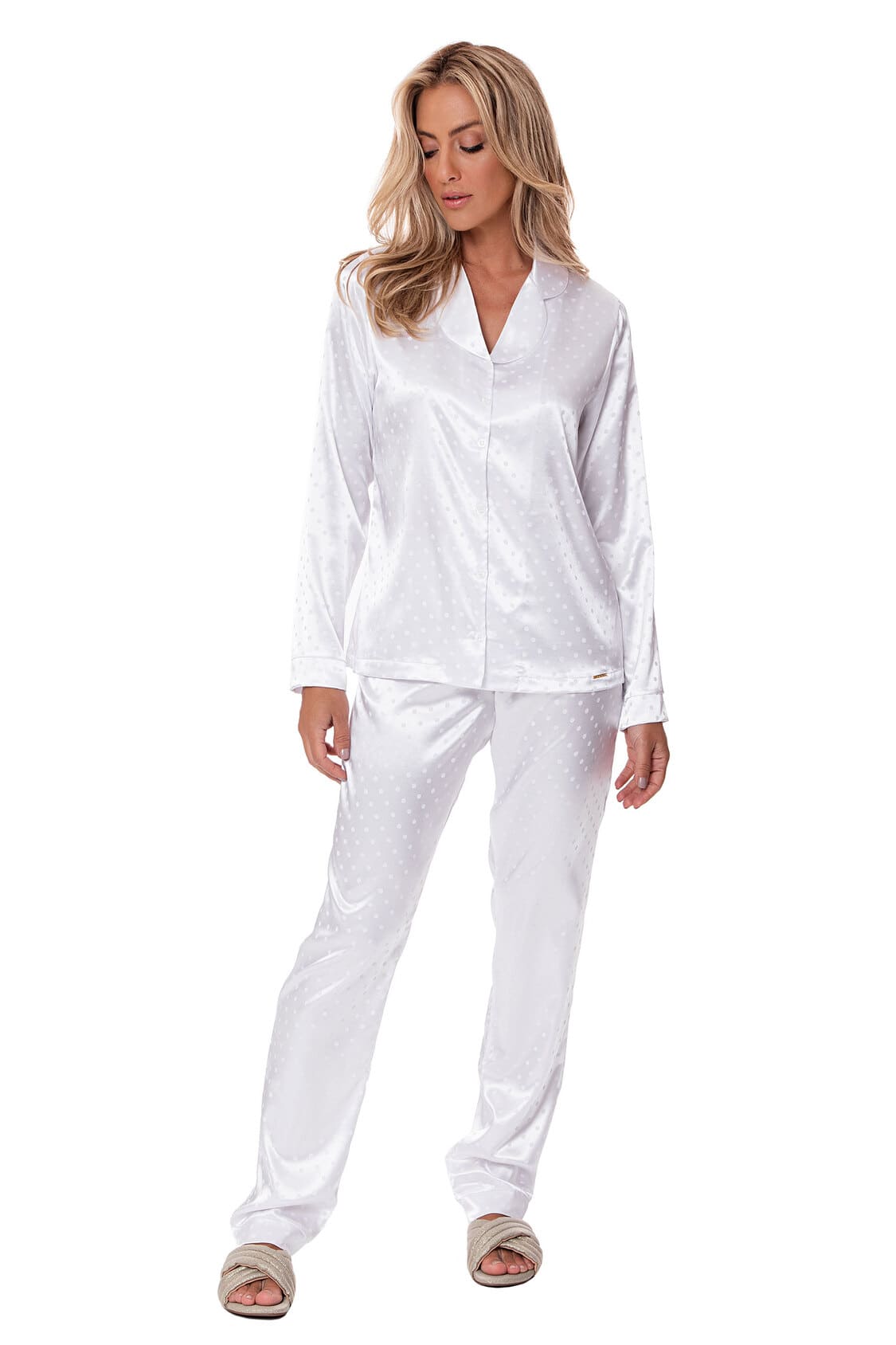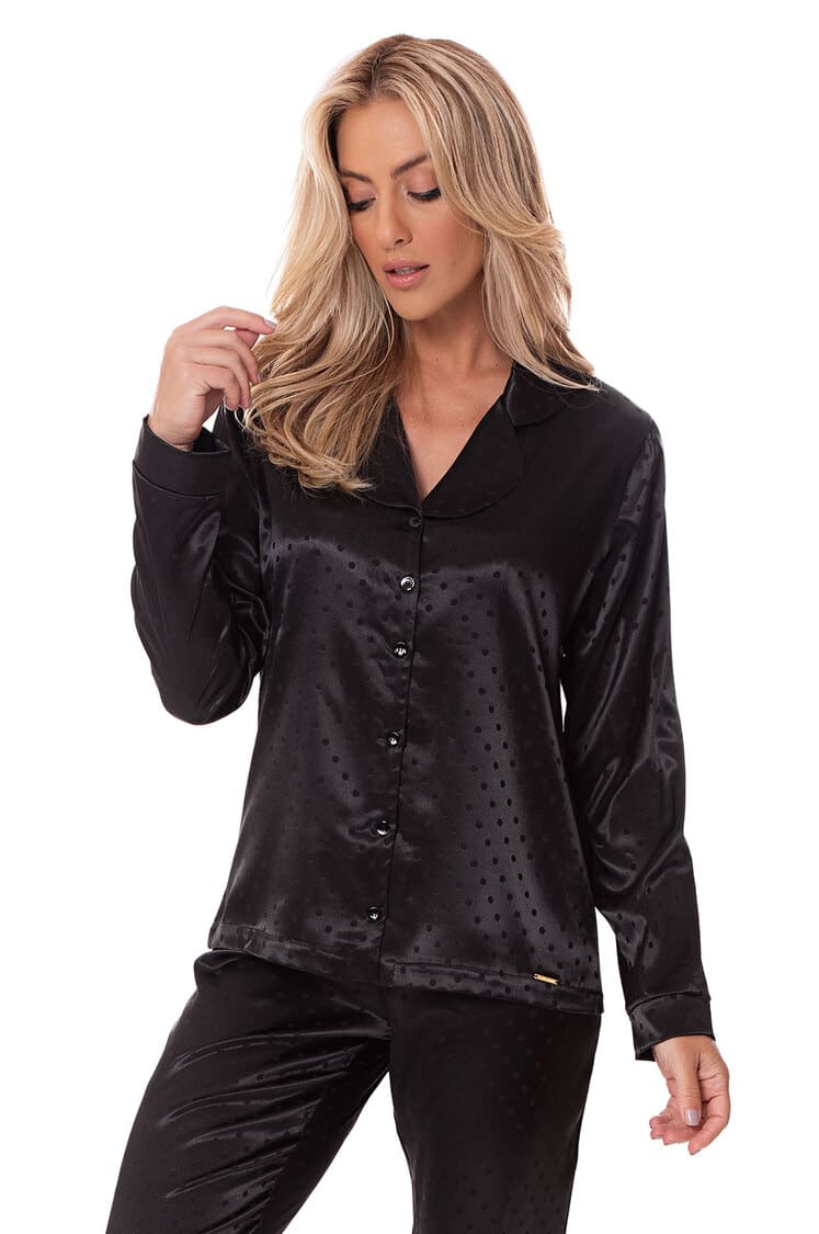 Pijama Leonora perfeito para a cliente que almeja uma produção sofisticada e elegante. É confeccionado em cetim leve, com padronagem e modelagem clássicas.