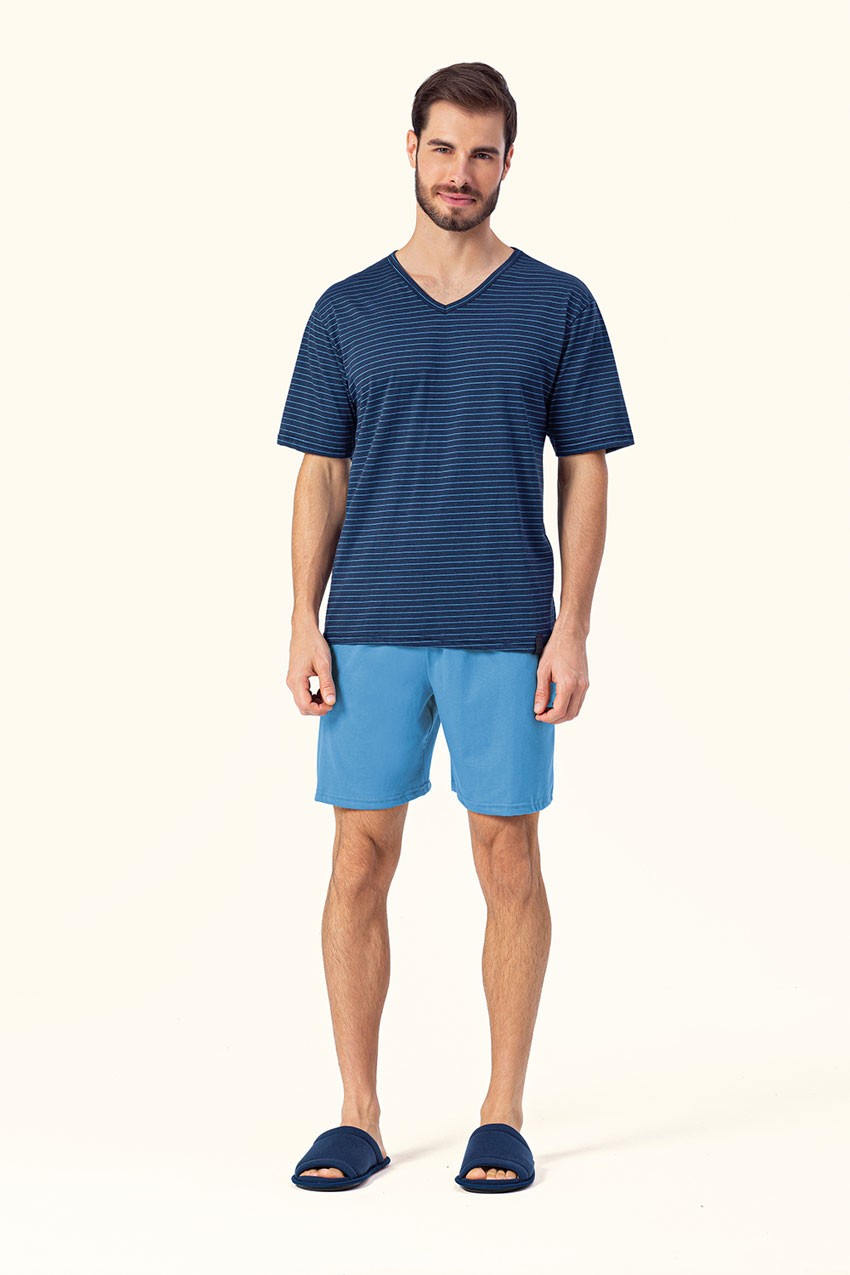 Este pijama manga curta da Lua Encantada é perfeito para as noites de verão. Feito em algodão macio e confortável, ele proporciona um sono tranquilo e agradável. Seu design masculino conta com uma linda combinação de cores: listras azul claro na blusa e short liso azul claro. Além disso, sua manga curta garante maior liberdade de movimento durante a noite.