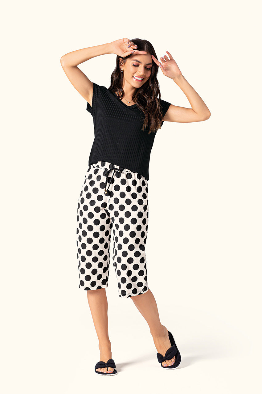 Pescador de manga curta de malha de viscose canelada na cor preta e calça de malha 100% algodão na cor branca com bolinhas pretas.