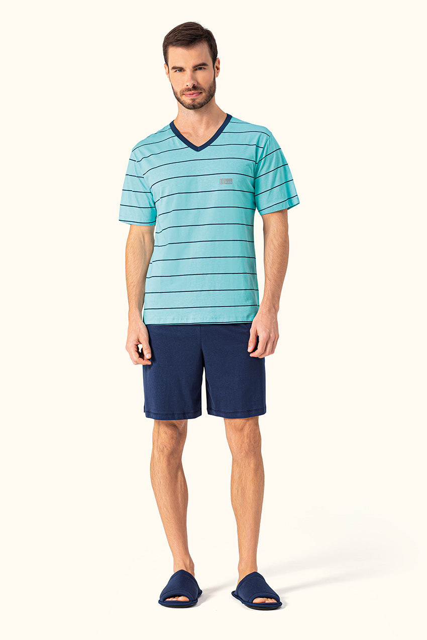 Pijama masculino de manga curta em malha 100% algodão na cor azul clara e listras na cor azul escura e shorts na mesma cor das listras.