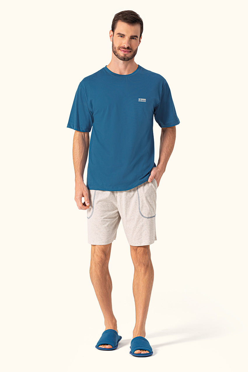 Pijama masculino de manga curta em malha 100% algodão na cor azul claro e shorts em malha mescla na cor cinza com detalhes no bolso.