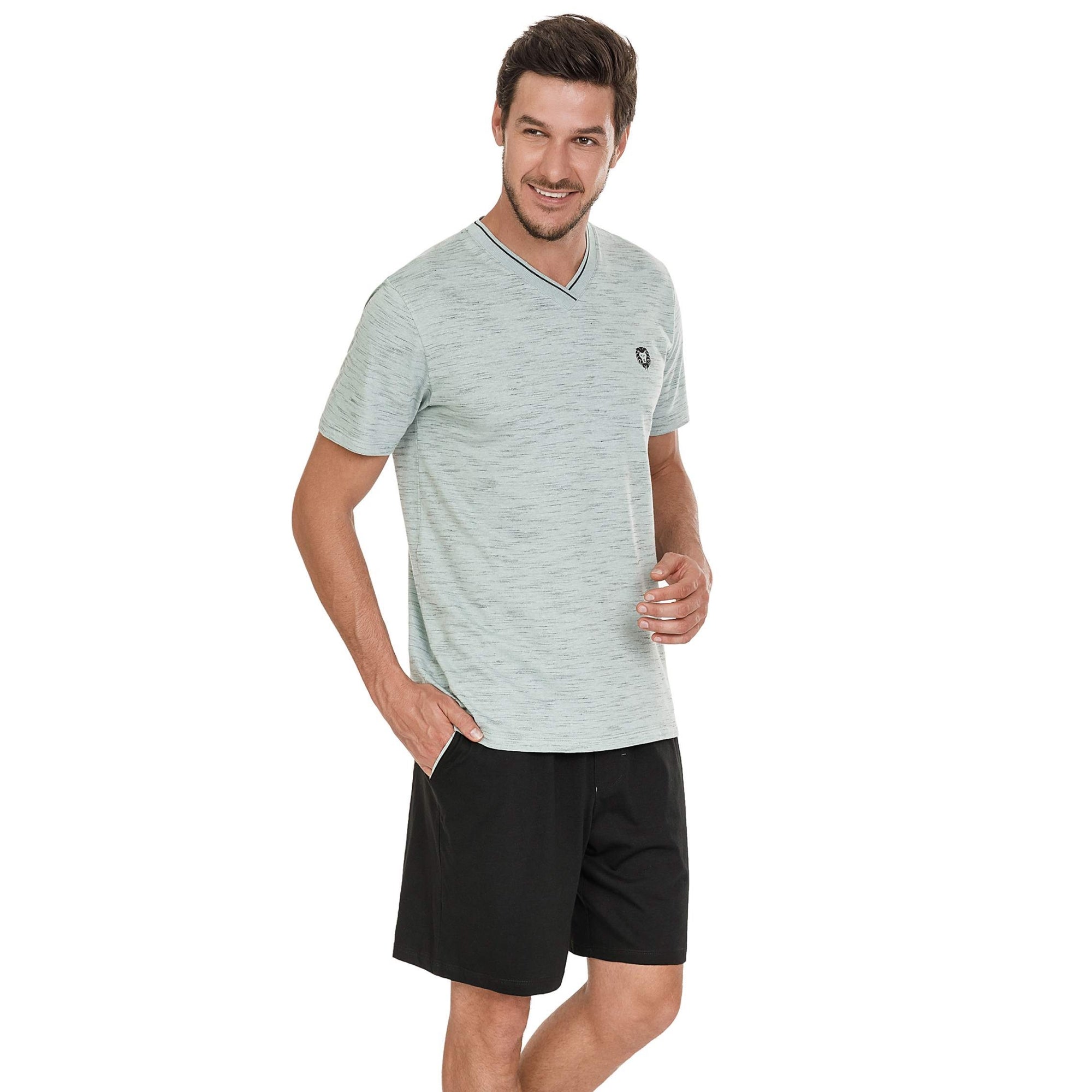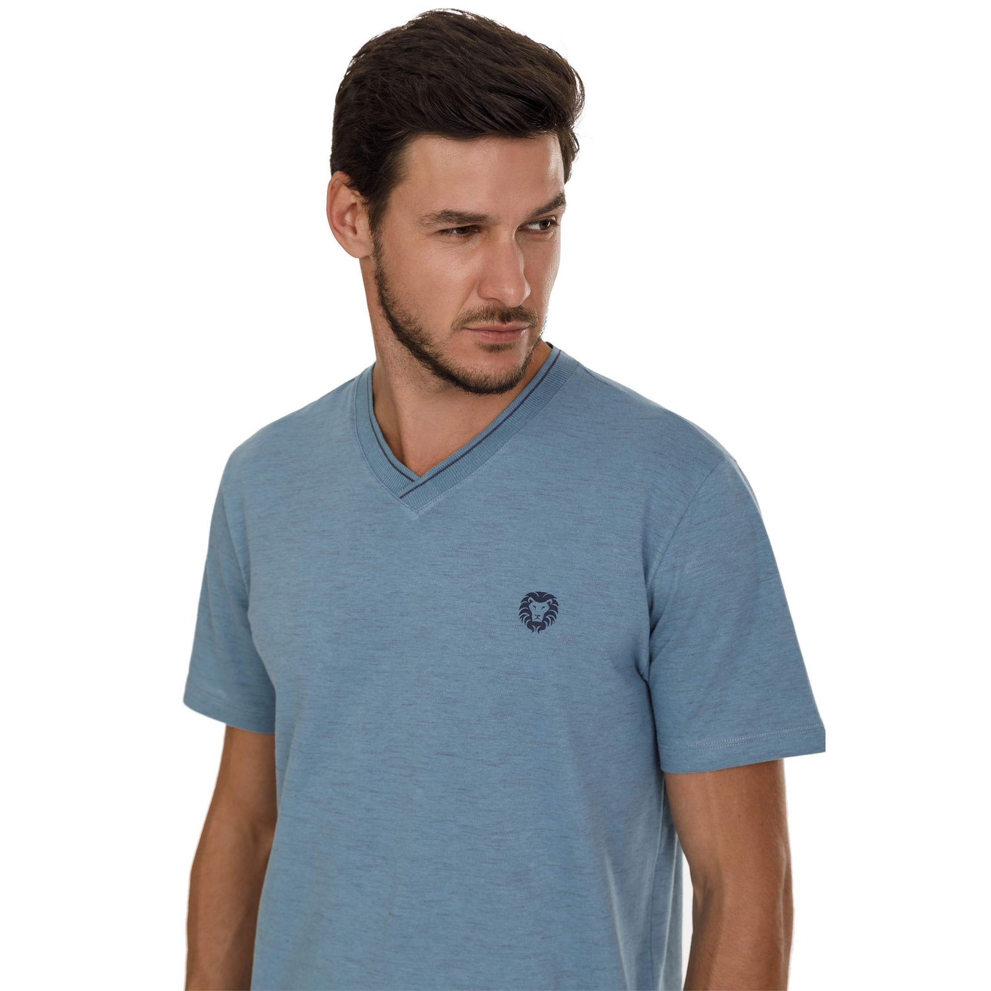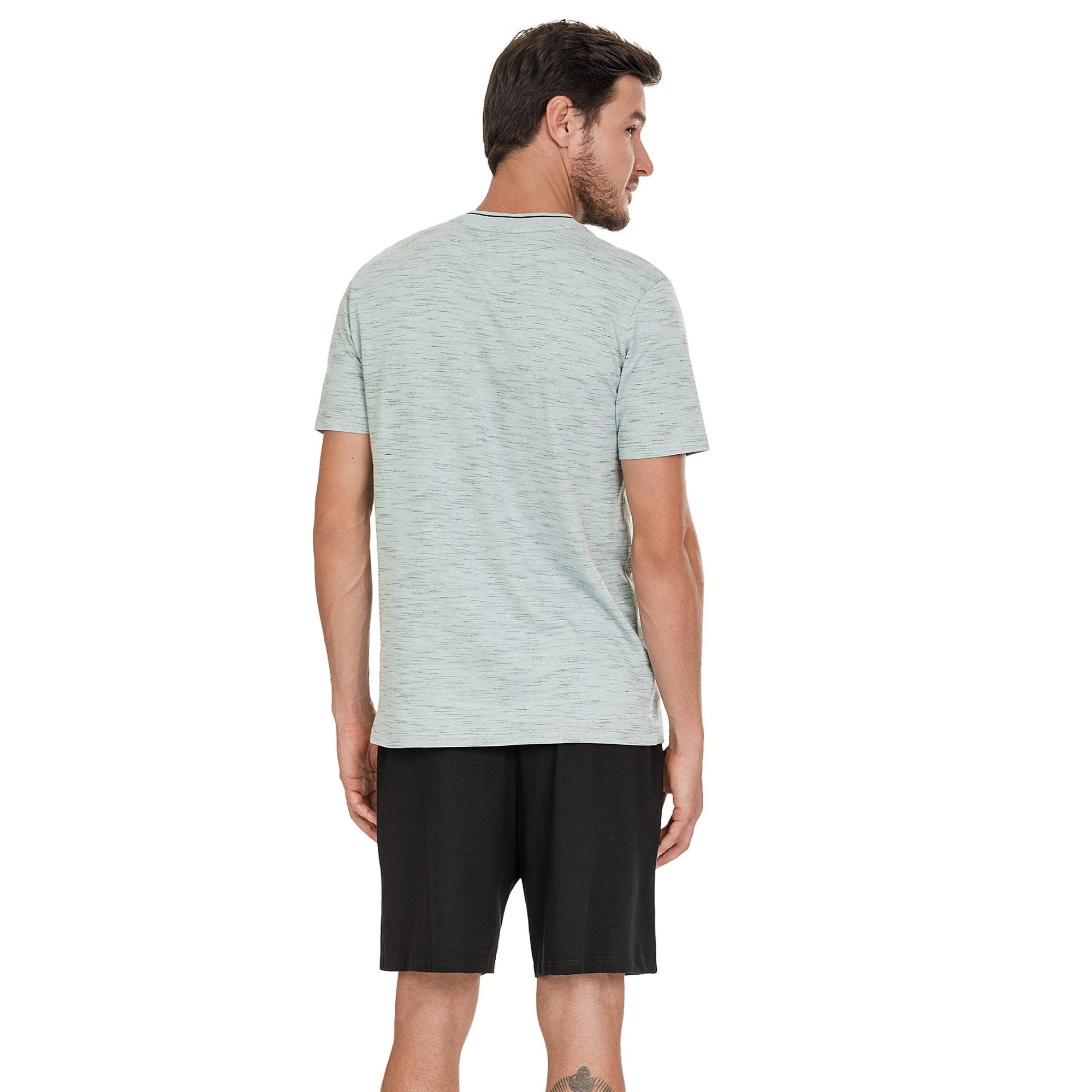 A camiseta do conjunto exibe um design rajado, moderno e sofisticado. Sua gola em V transpassado em ribana adiciona uma pitada extra de elegância à peça, tornando-a perfeita para aqueles momentos relaxantes em casa ou para as noites de sono mais confortáveis.