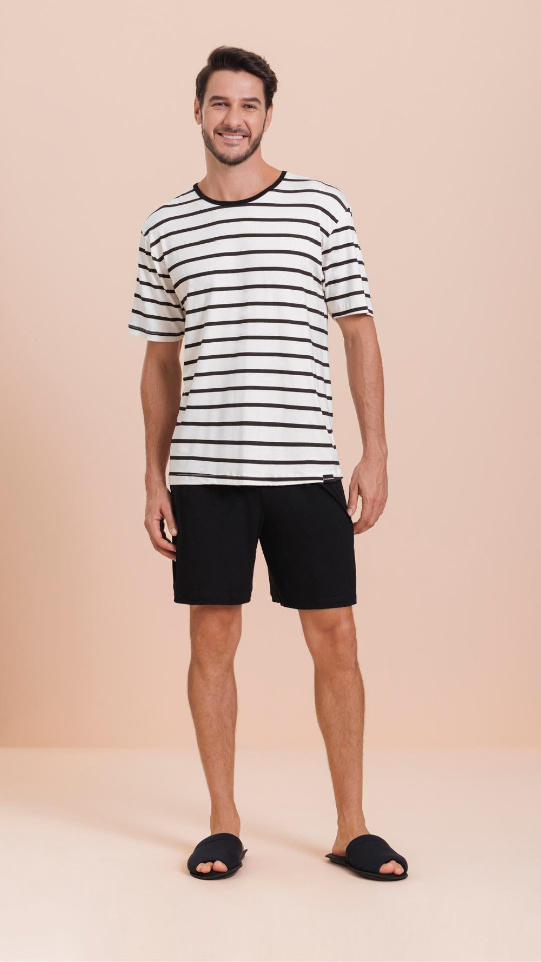 A modelagem com camiseta de manga curta e bermuda garante liberdade de movimentos, sendo perfeita para os dias mais quentes de primavera e verão. Seu design moderno e delicado acompanha as tendências do homewear masculino, unindo praticidade, estilo e bem-estar.