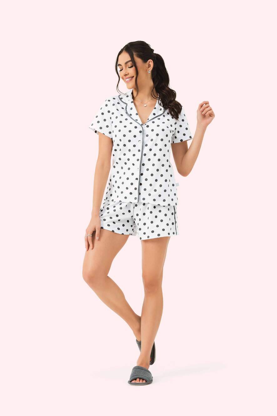 Short doll de manga curta aberto com botões, de malha em 100% algodão na cor branca com bolinhas e viés na cor preta.