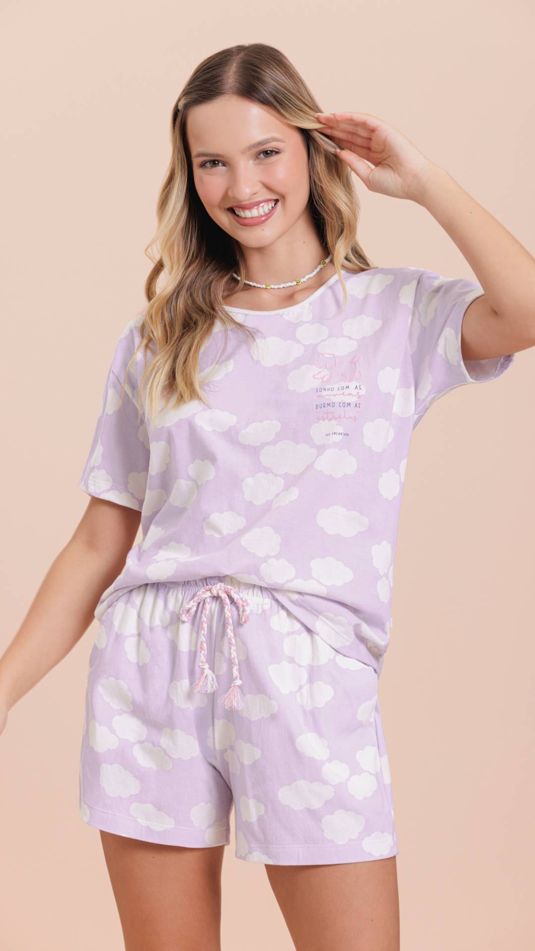 O Short Doll Manga Curta Sonhadora - Lua Encantada é o conjunto perfeito para noites de sono confortáveis e dias relaxantes. Confeccionado em 100% algodão, ele oferece um toque suave e respirável, ideal para as estações de primavera e verão. A blusa de manga curta proporciona frescor, enquanto o short com caimento leve permite liberdade de movimento, garantindo um descanso completo.